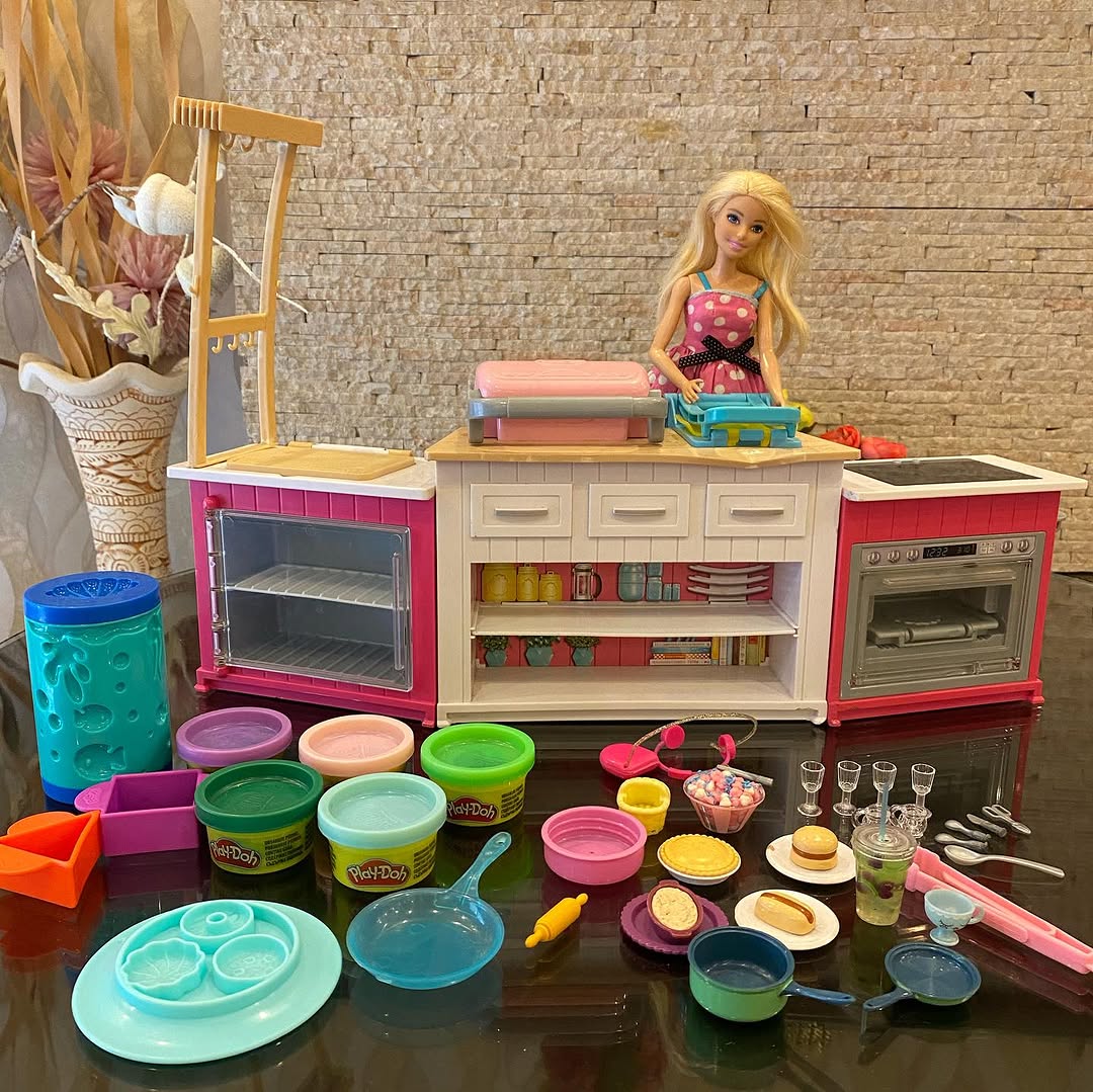 Barbie Kitchen Playset with Doll, Lights & Sounds, Food Molds, 5 Dough Colors and 20+ Accessories #preloved