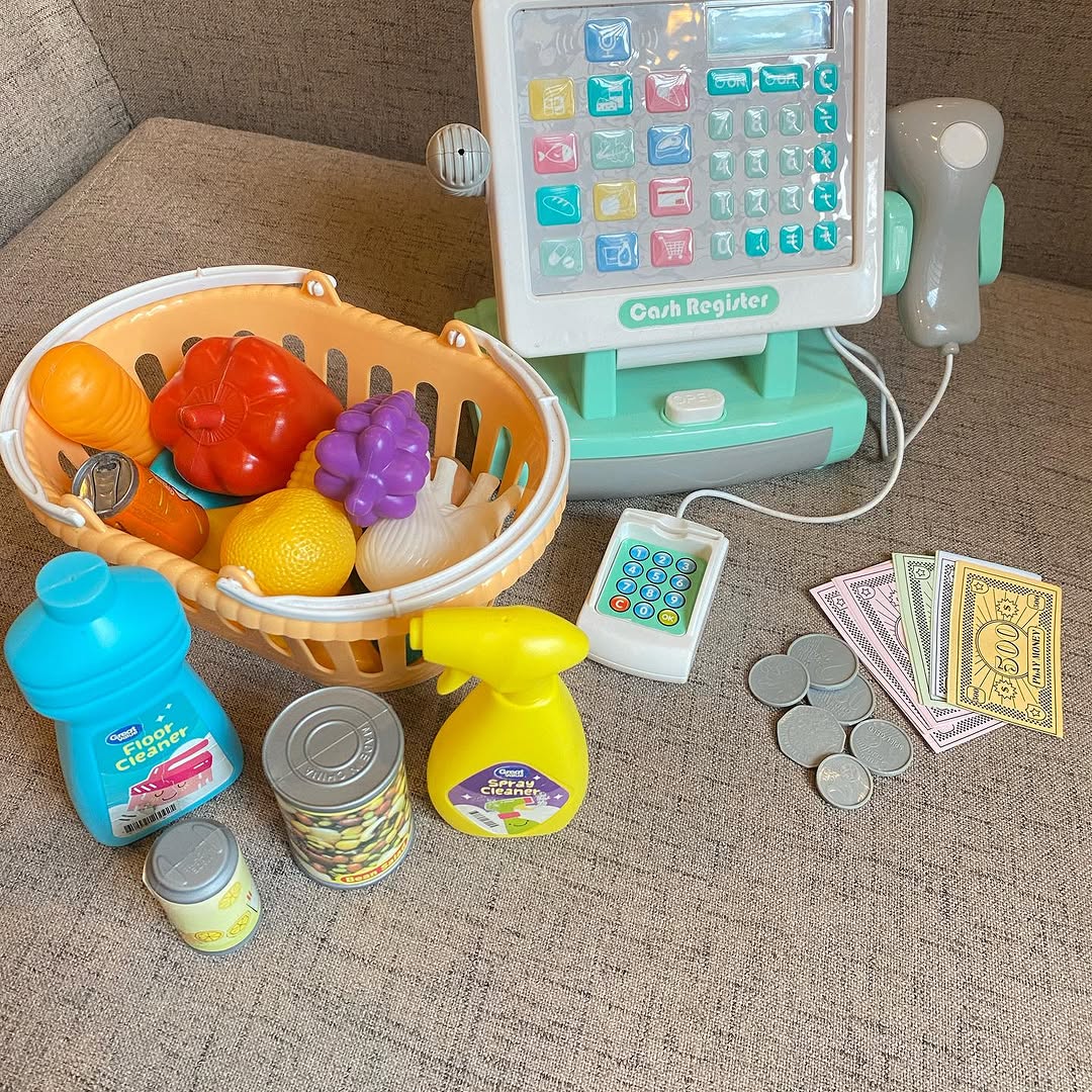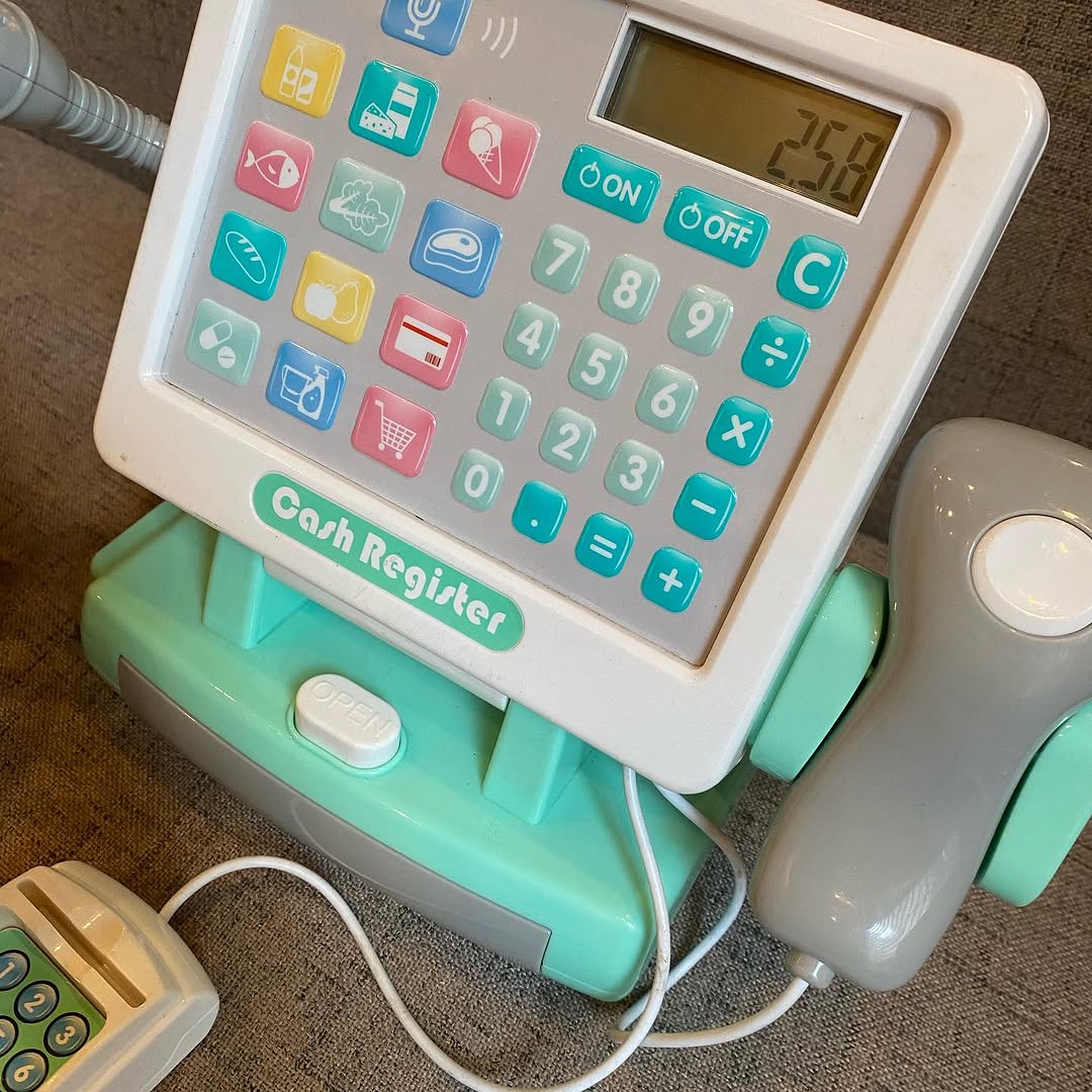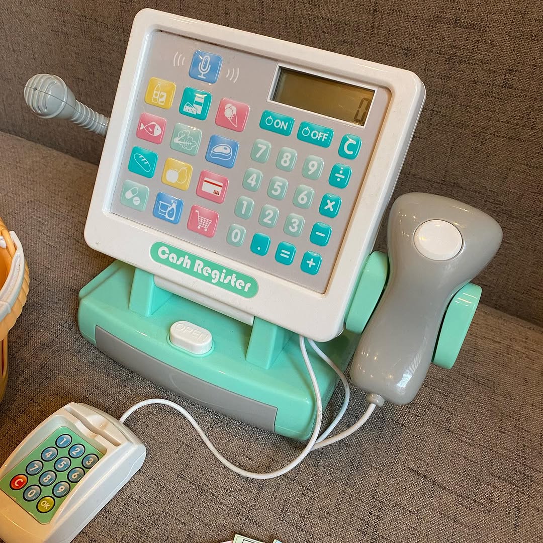#Sold Price 3500/- Cash Register With pretend scanner, card reader and Working active Mic. Includes a vegetable basket and accessories #preloved