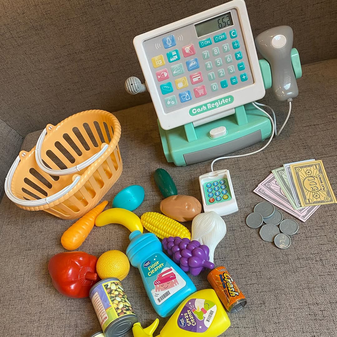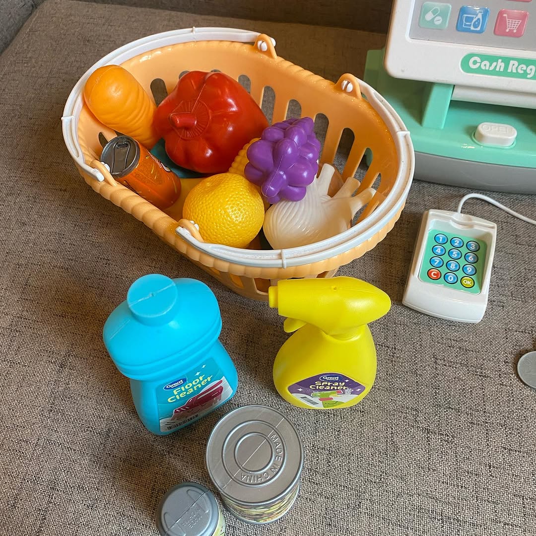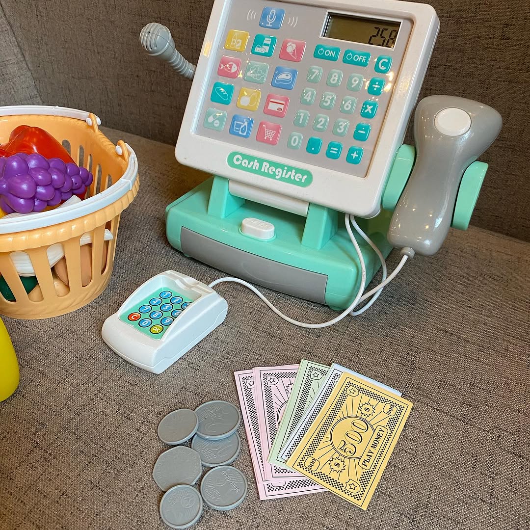#Sold Price 3500/- Cash Register With pretend scanner, card reader and Working active Mic. Includes a vegetable basket and accessories #preloved
