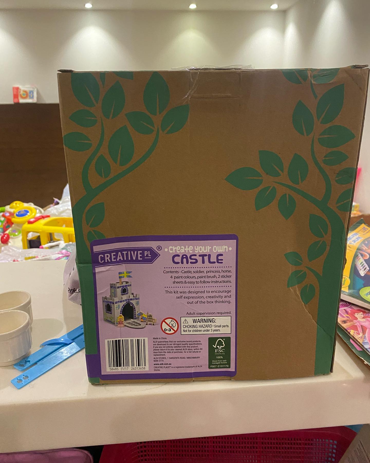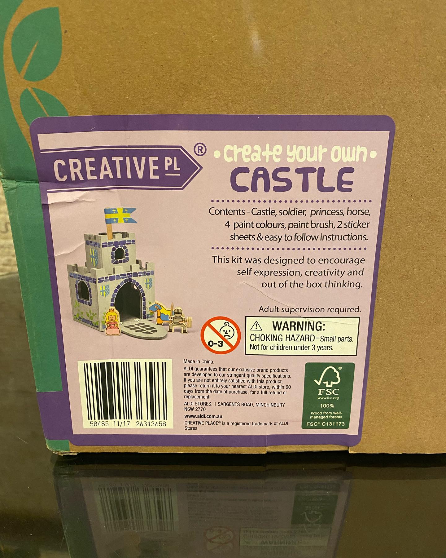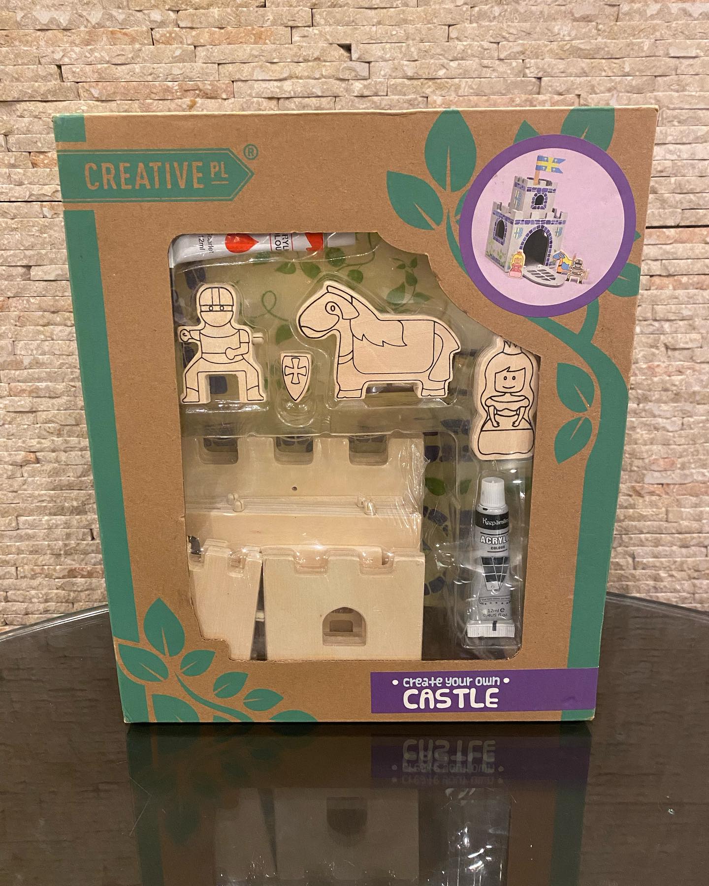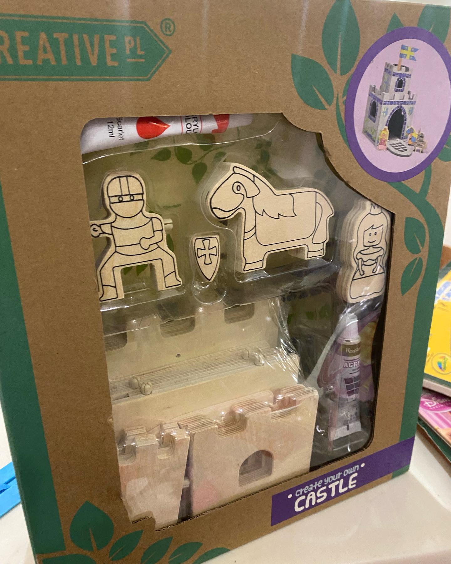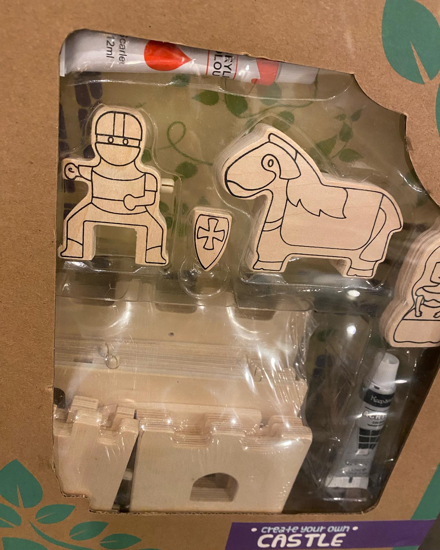 Contents – Castle, soldier, princess, horse, 4 paint colours, paint brush, 2 sticker sheets & easy to follow instructions.