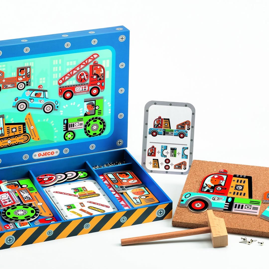 Contents: 24 pieces of vehicle components, 5 design cards, 1 cork board and 40 thumbtacks