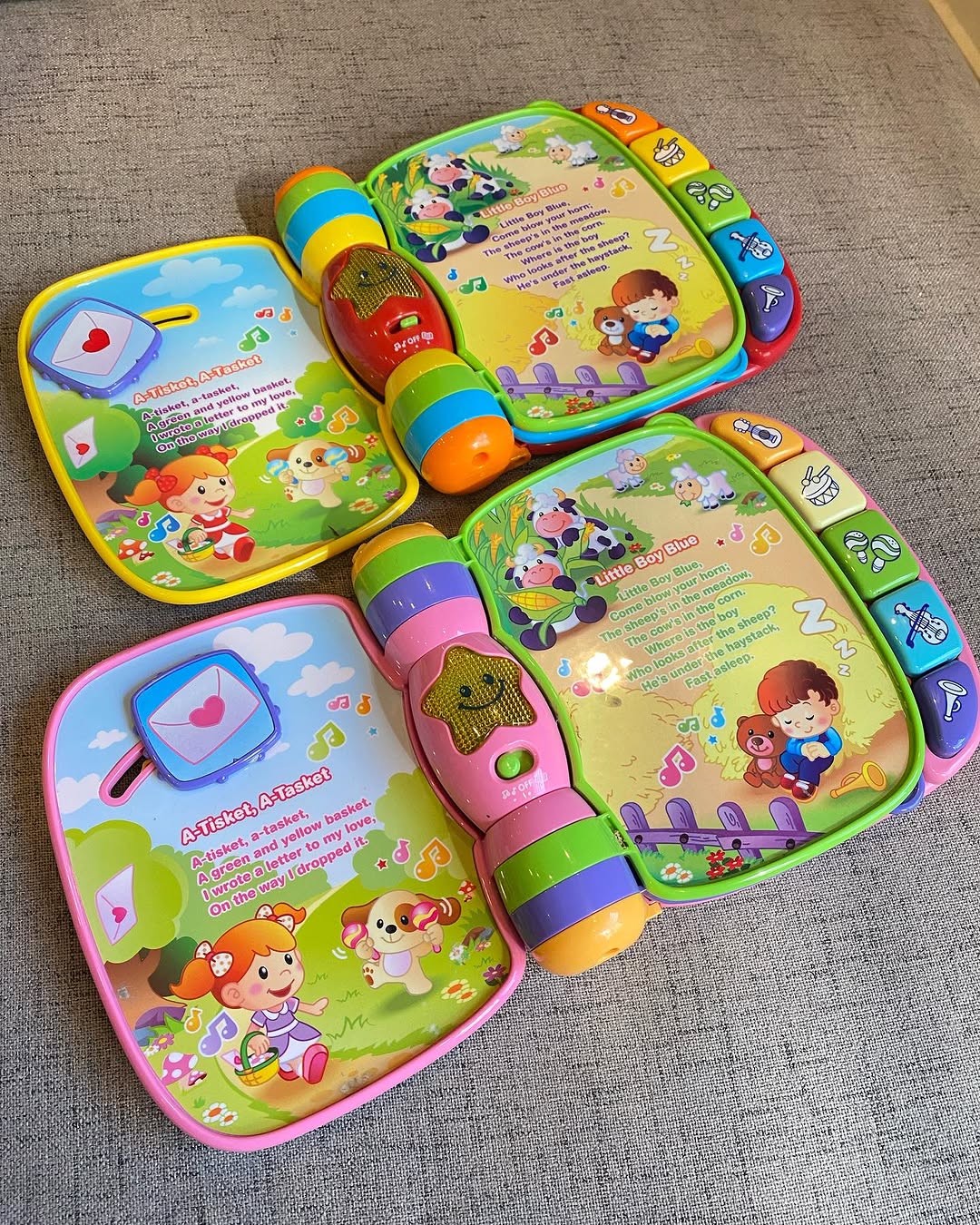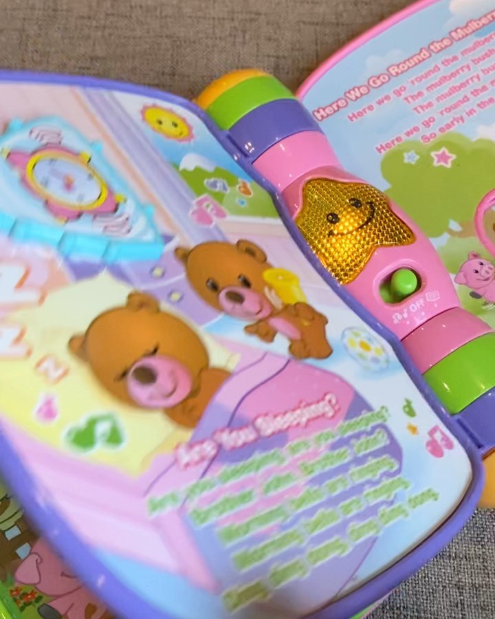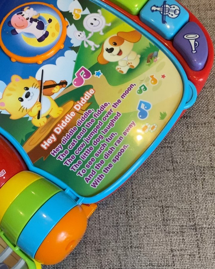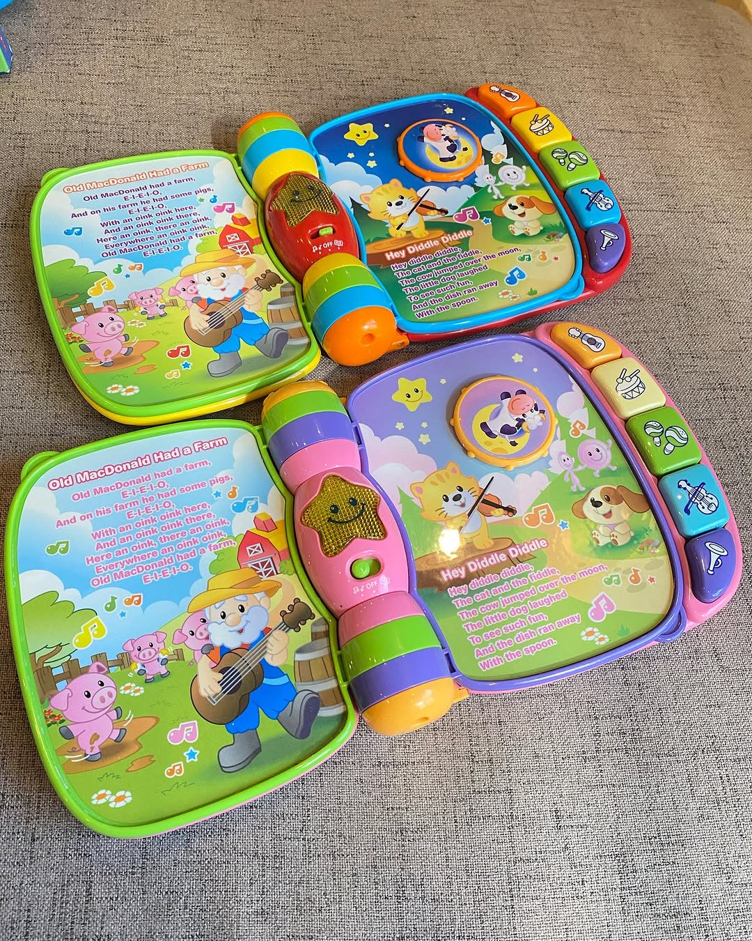 Price 2500/- Each. Vtech Musical Rhymes Book. Explore classic nursery rhymes and build fine motor skills with the Musical Rhymes Book. Slide and twist the fun play pieces with each easy-to-turn page. Play piano sounds with the five colorful piano keys that introduce colors and instruments. Switch between two fun modes that introduce age-appropriate vocabulary, music and instrument sounds. Read, rhyme and play!